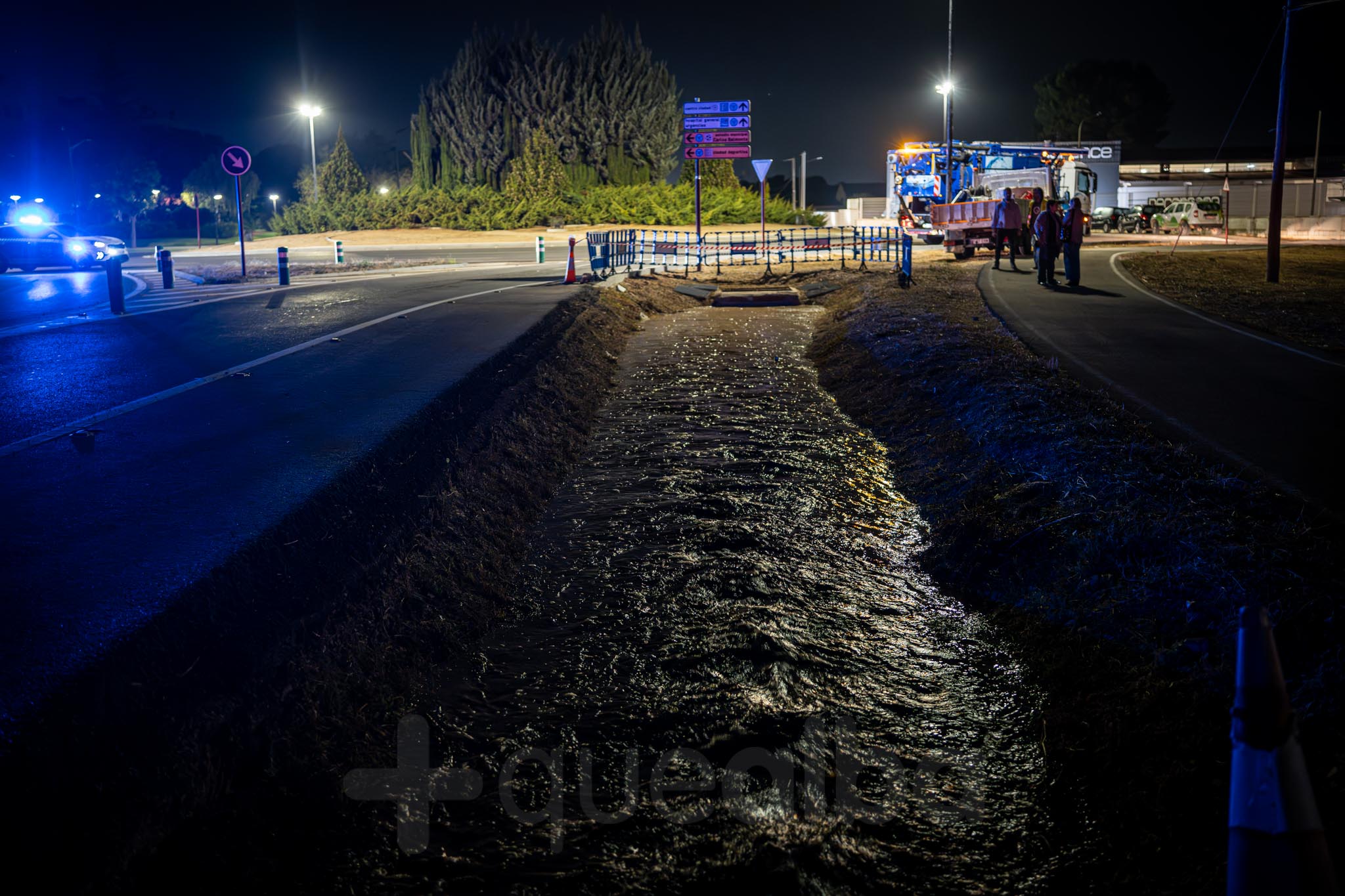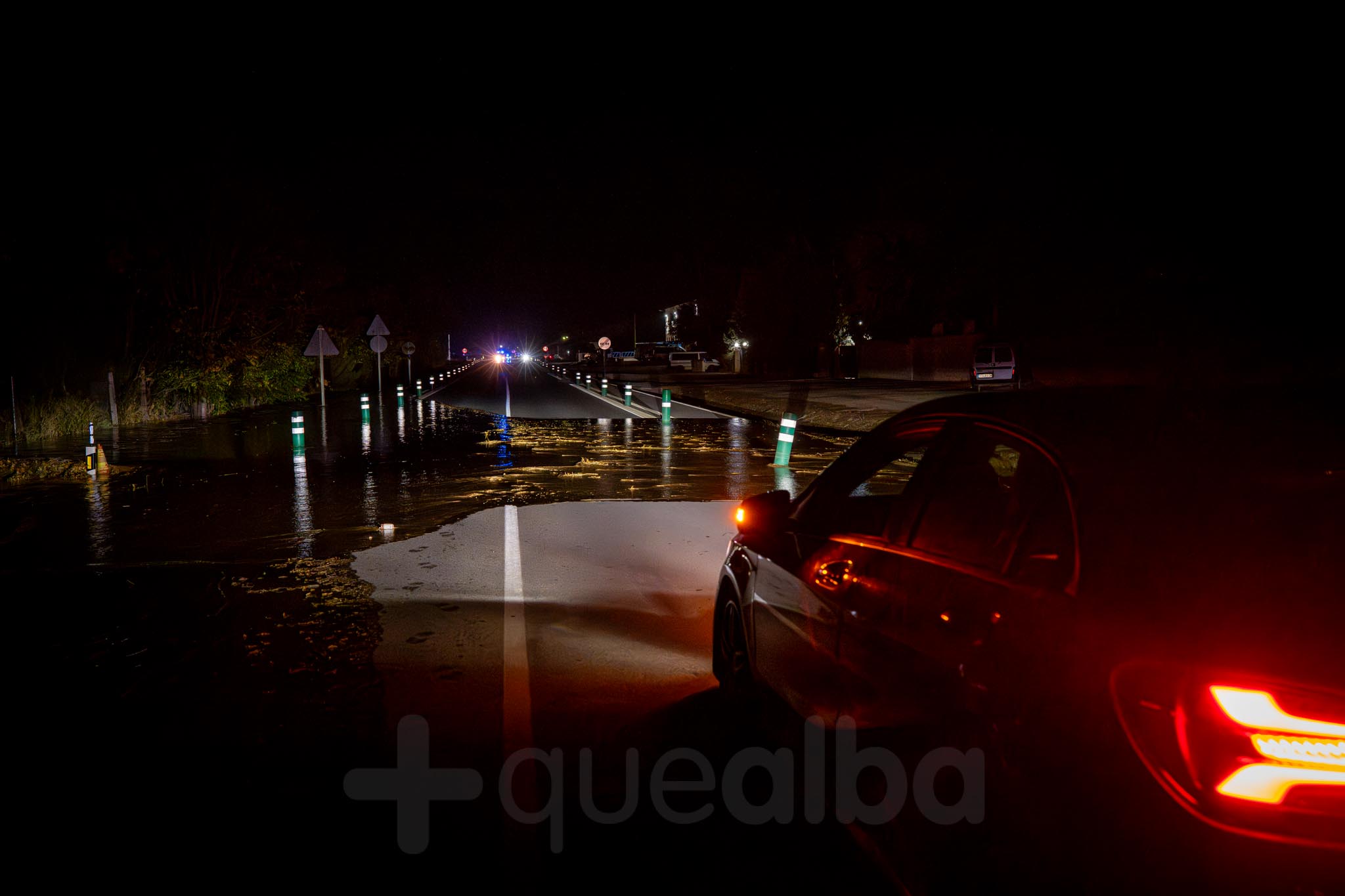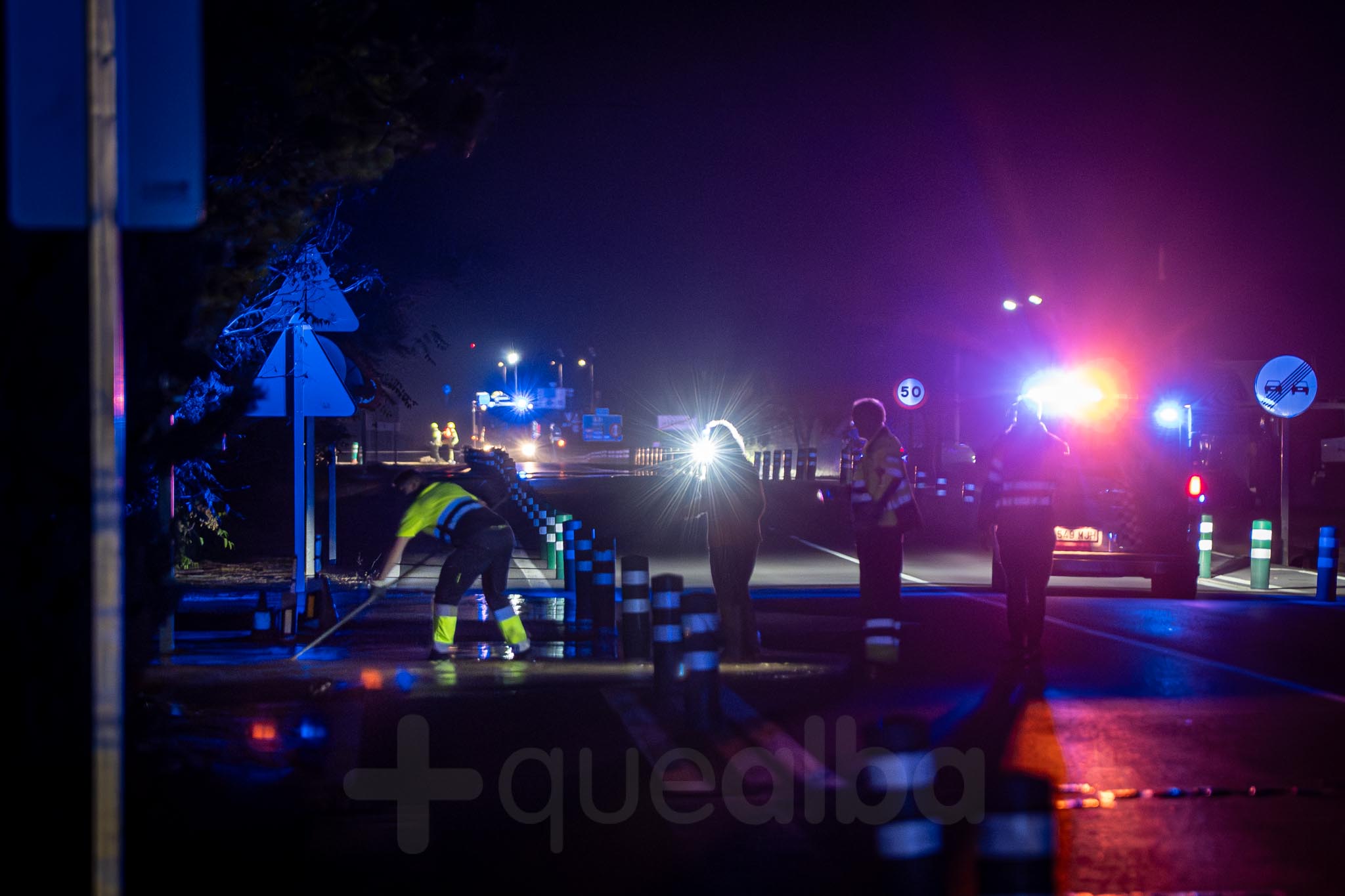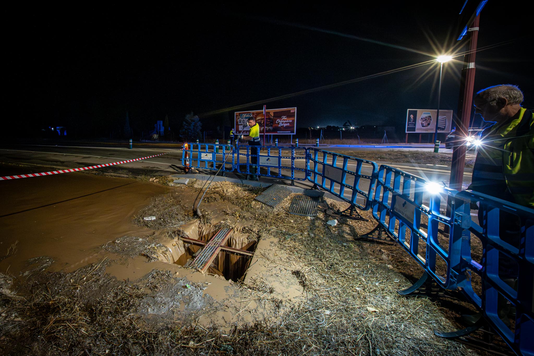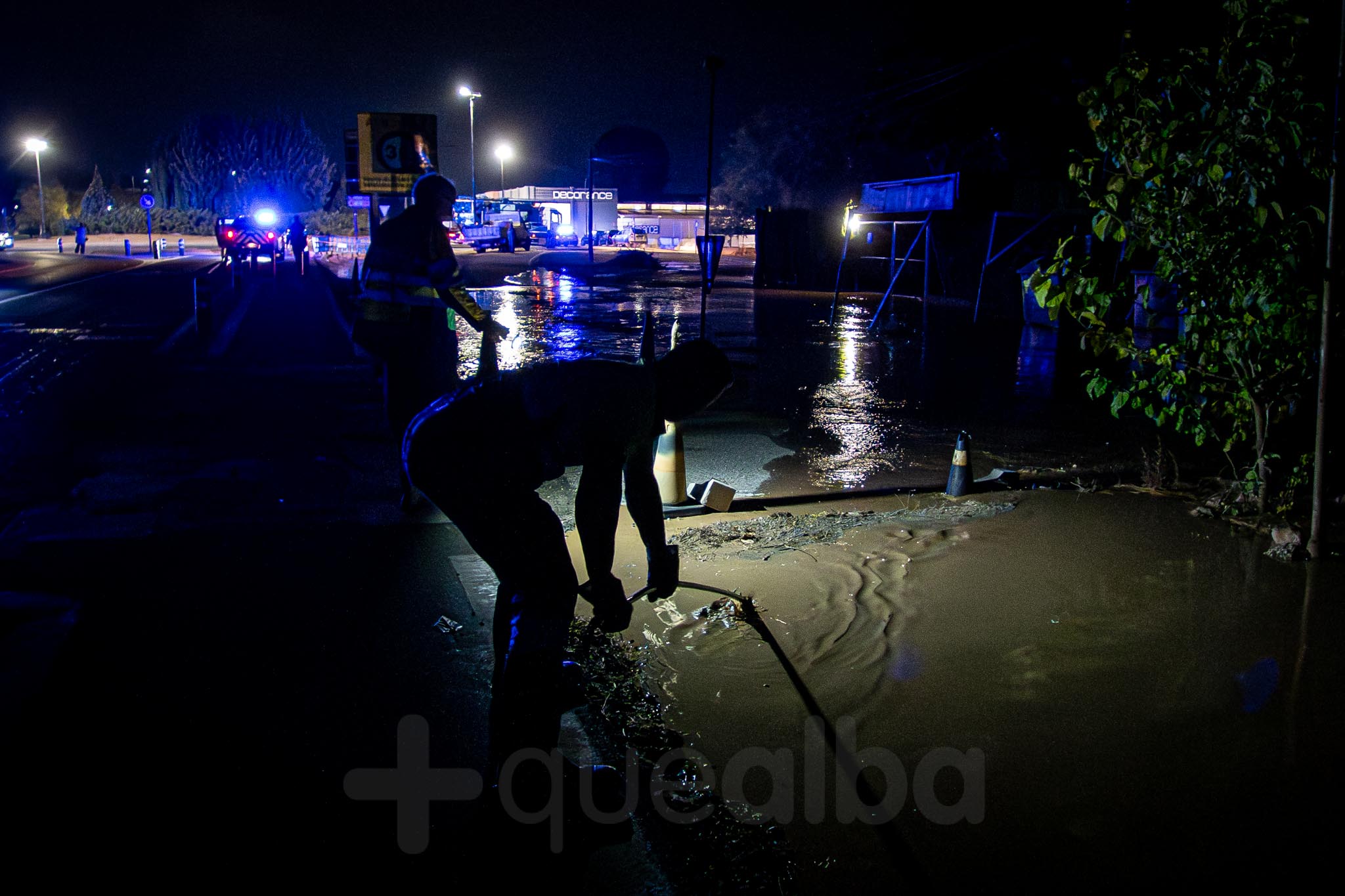 Desde alrededor de las 9 de la noche, bomberos y policía trabajan en la entrada a Albacete por la carretera de Valencia, tras la tromba de agua en Chinchilla de Montearagón, que ha vuelto a provocar inundaciones en este acceso a la ciudad por La Casita.