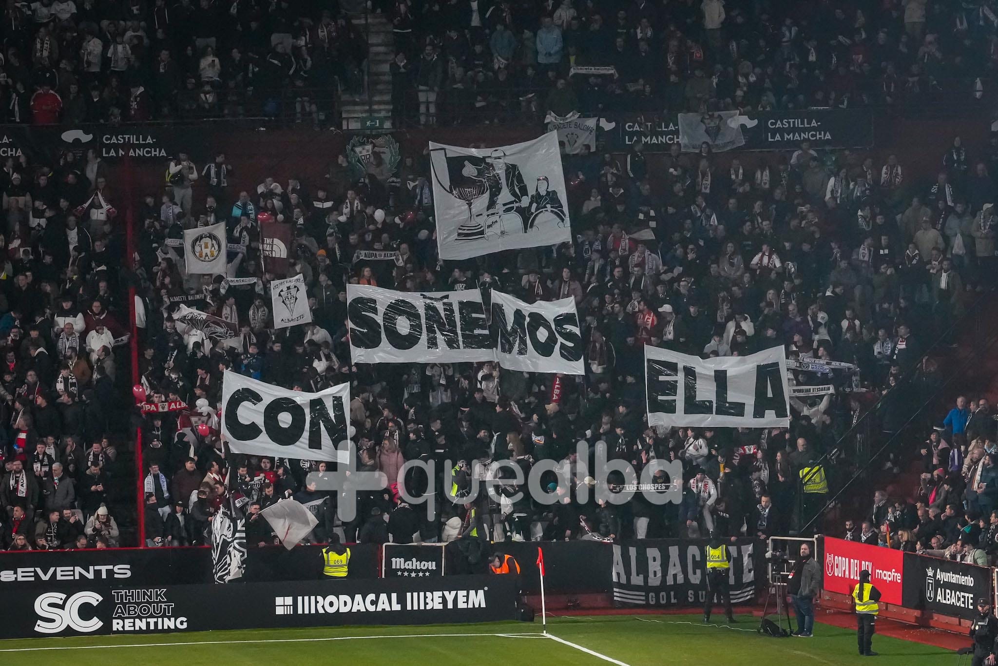 Llamativa pancarta inicial en el Albacete Balompié -Real Madrid que fue toda una profecía. «Soñemos con ella» y la Copa del Rey junto a los míticos protagonistas de ‘Amanece, que no es poco’ en el célebre sidecar de la película que José Luis Cuerda rodó en localidades de la Sierra del Segura.