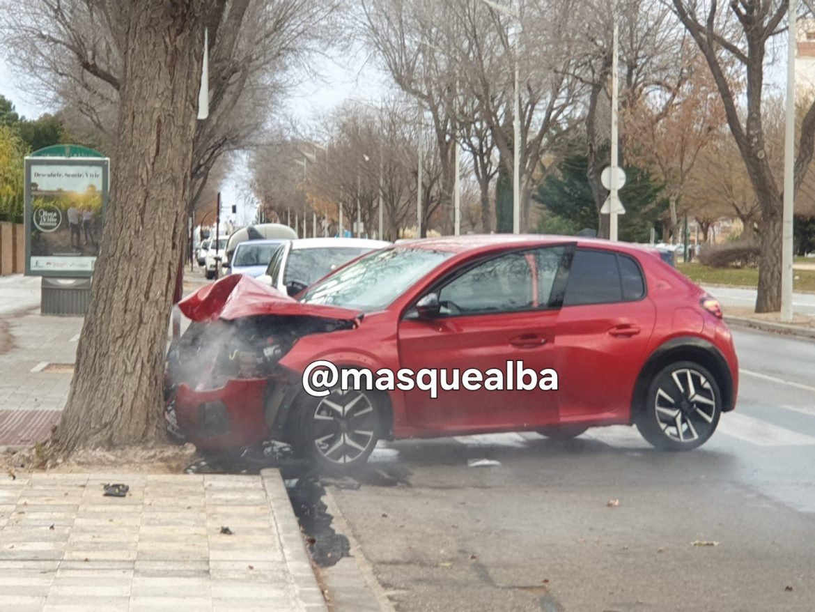 Alrededor de las cinco de esta tarde ha tenido lugar un llamativo accidente en el Paseo de la Cuba. Un vehículo se estrellaba con un árbol y el impacto dejaba destrozada la parte delantera del mismo.