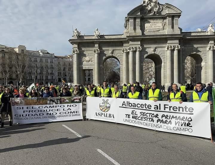 No ha faltado un numeroso grupo de agricultores y ganaderos albaceteños, movilizados en distintos autobuses, que han llegado hasta la capital de España para escenificar su descontento con los precios que reciben por sus productos, los elevados costes de producción o la burocracia en exceso que les exige la Política Agraria Comunitaria.