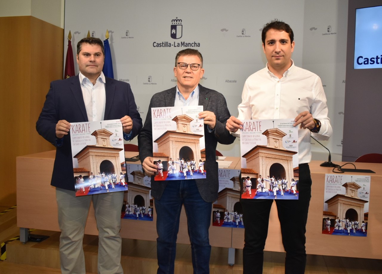 El diputado provincial de Deportes, Daniel Sancha, ha participado en la presentación del Campeonato Regional de Kárate en Edad Escolar junto al delegado de Educación y Deportes de la JCCM, Diego Pérez, y al responsable provincial de la Federación española de Kárate, Antonio Carretero.