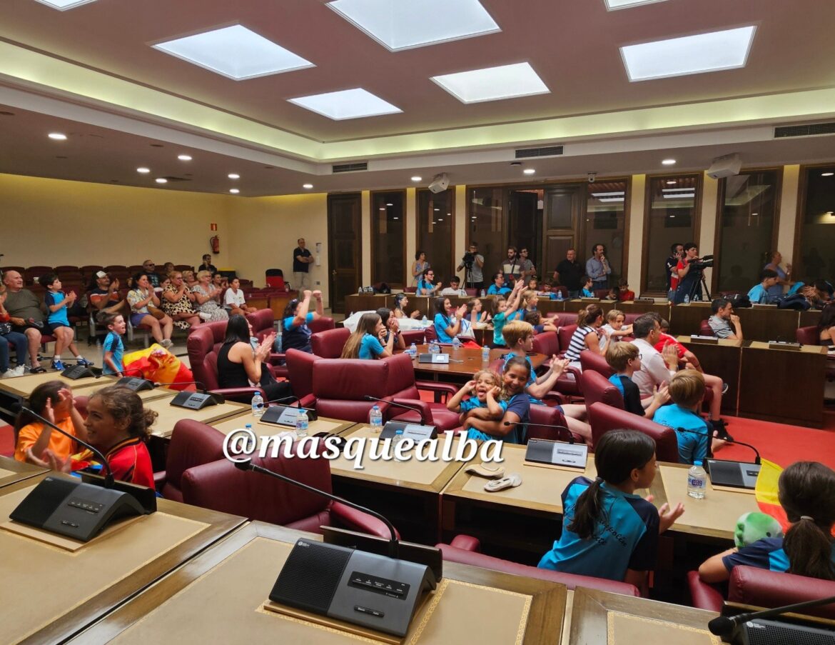 Decenas de personas se han dado cita en el Salón de Plenos del Ayuntamiento de Albacete para animar a la gimnasta albaceteña Noemí Romero en su participación en los Juegos Olímpicos de París, en salto de trampolín.
