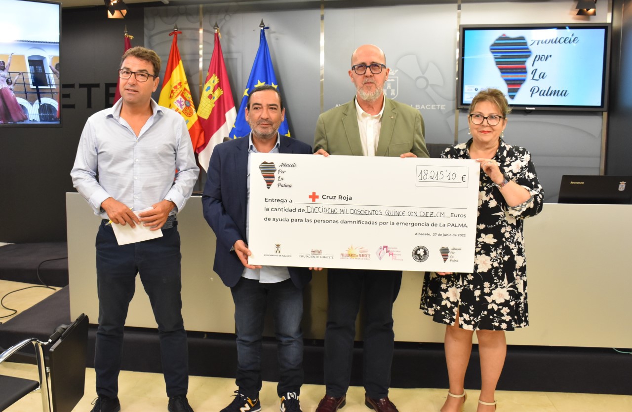 El Ayuntamiento de Albacete ha acogido el acto de entrega de un cheque por importe de 18.215,10 euros a Cruz Roja, por parte de la Asociación Provincial de Peluquería y Afines; la Asociación de Esteticistas de Albacete y Provincia, y Peluqueros Solidarios, fruto de la recaudación obtenida en el acto solidario ‘Albacete por La Palma’, organizado para ayudar a las personas damnificadas por la erupción del volcán.