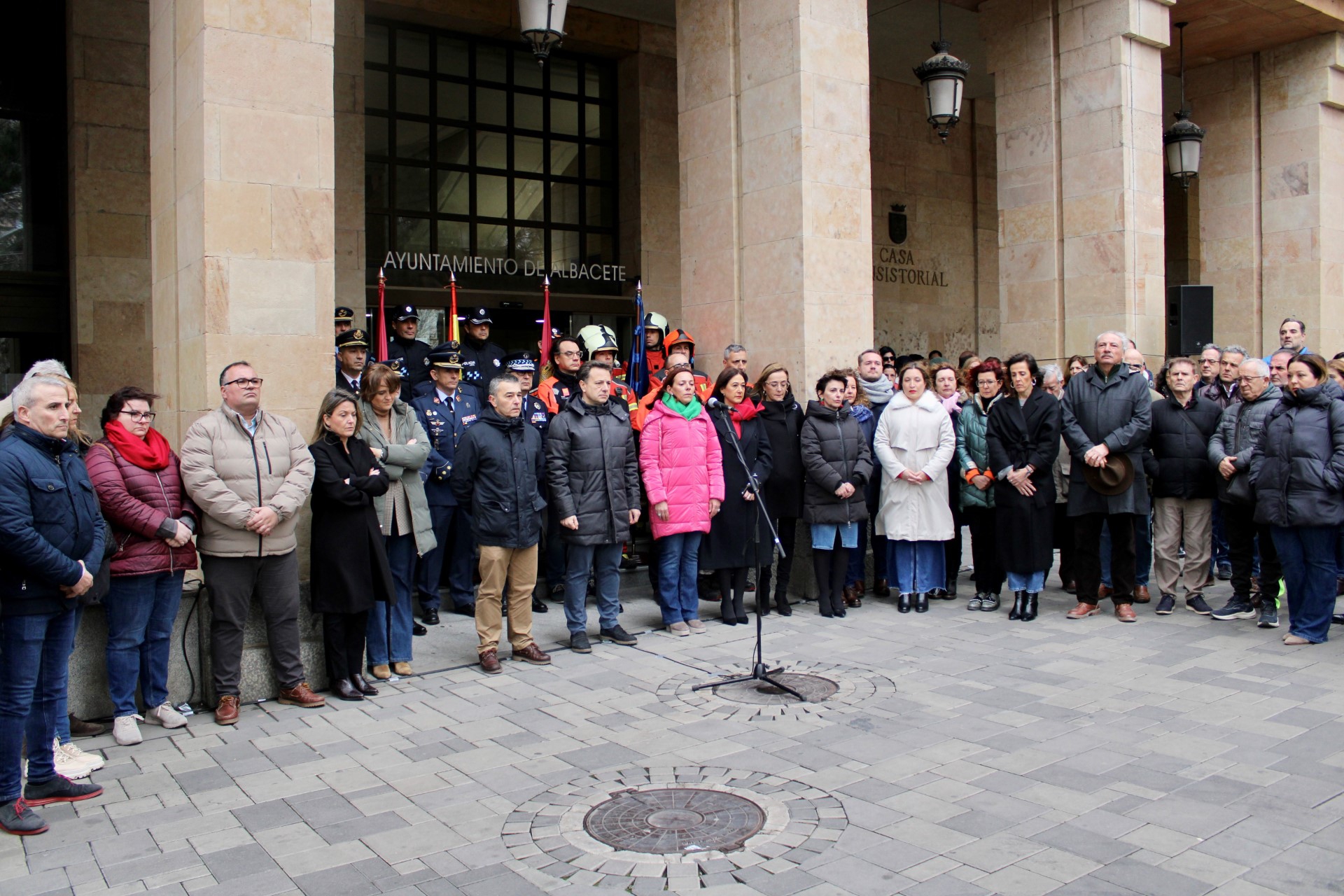 El alcalde de Albacete ha participado este mediodía, en la puerta del Ayuntamiento, en un minuto de silencio en recuerdo y homenaje a los fallecidos, heridos y personas afectadas en el devastador incendio ocurrido en un edificio de viviendas de Valencia. La concentración ha contado con diversos representantes públicos de varias administraciones, así como ciudadanos particulares que se han sumado a la iniciativa.