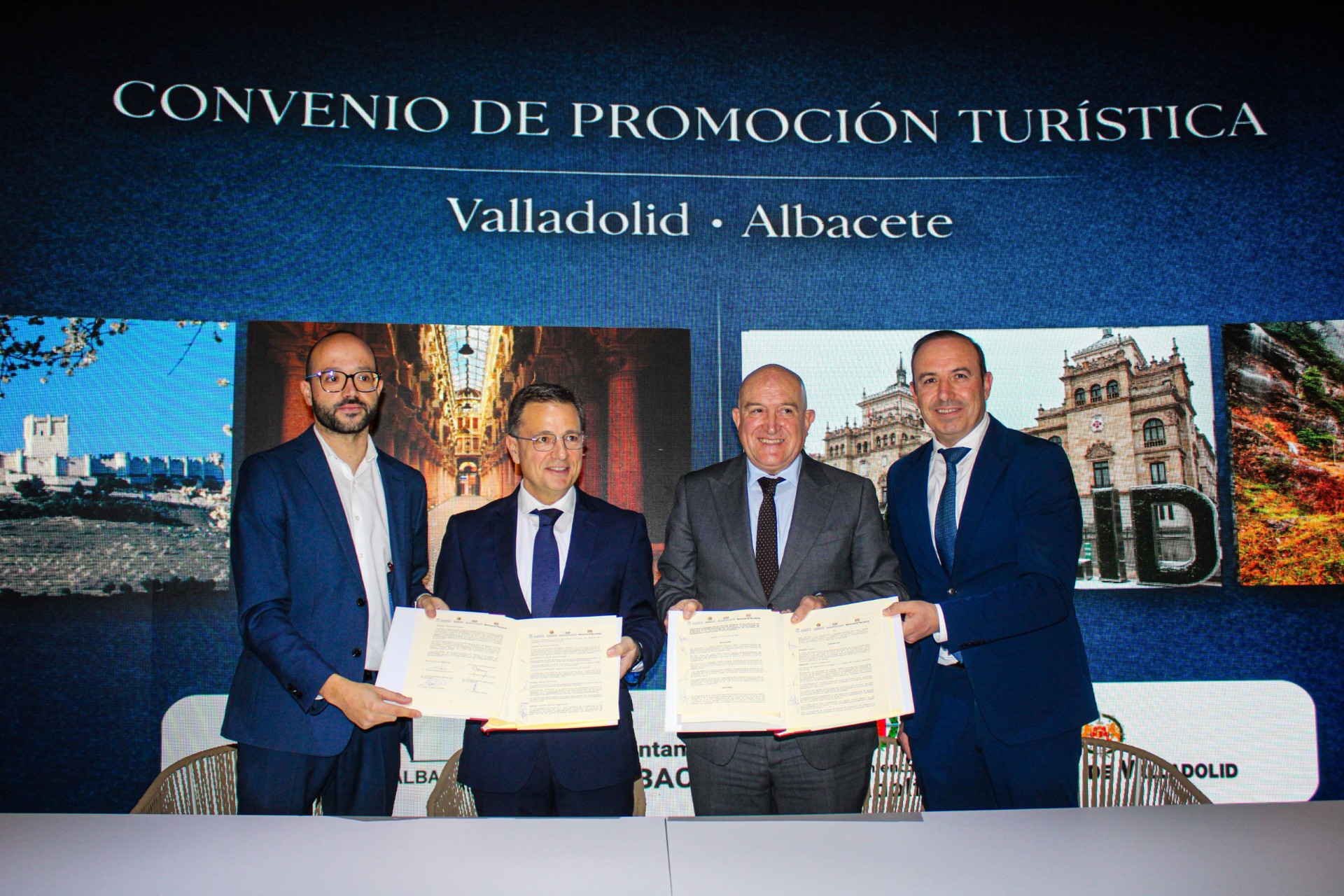 El alcalde de Albacete, Manuel Serrano, el alcalde de Valladolid, Jesús Julio Carnero, el vicepresidente de la Diputación albaceteña, Fran Valera, y su homónimo vallisoletano, Víctor Alonso Monge, han suscrito un protocolo de colaboraciónen el stand de Castilla y León en Fitur 2026 para crear sinergias que potencien el turismo en ambos territorios a través, principalmente, de la gastronomía.