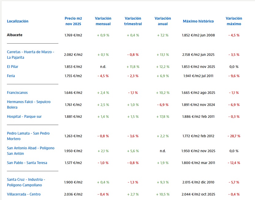 En la ciudad de Albacete, el precio de la vivienda ha subido un 7,2% en el último año, hasta situarse en 1.769 euros el metro cuadrado, de media. Por barrios, las principales subidas en el último año se han dado en Hospital-Parque Sur, con un 17,8% más; Carretas-Huerta de Marzo-La Pajarita, con un 13,1% más; y en El Pilar, con un incremento del 12,2%.