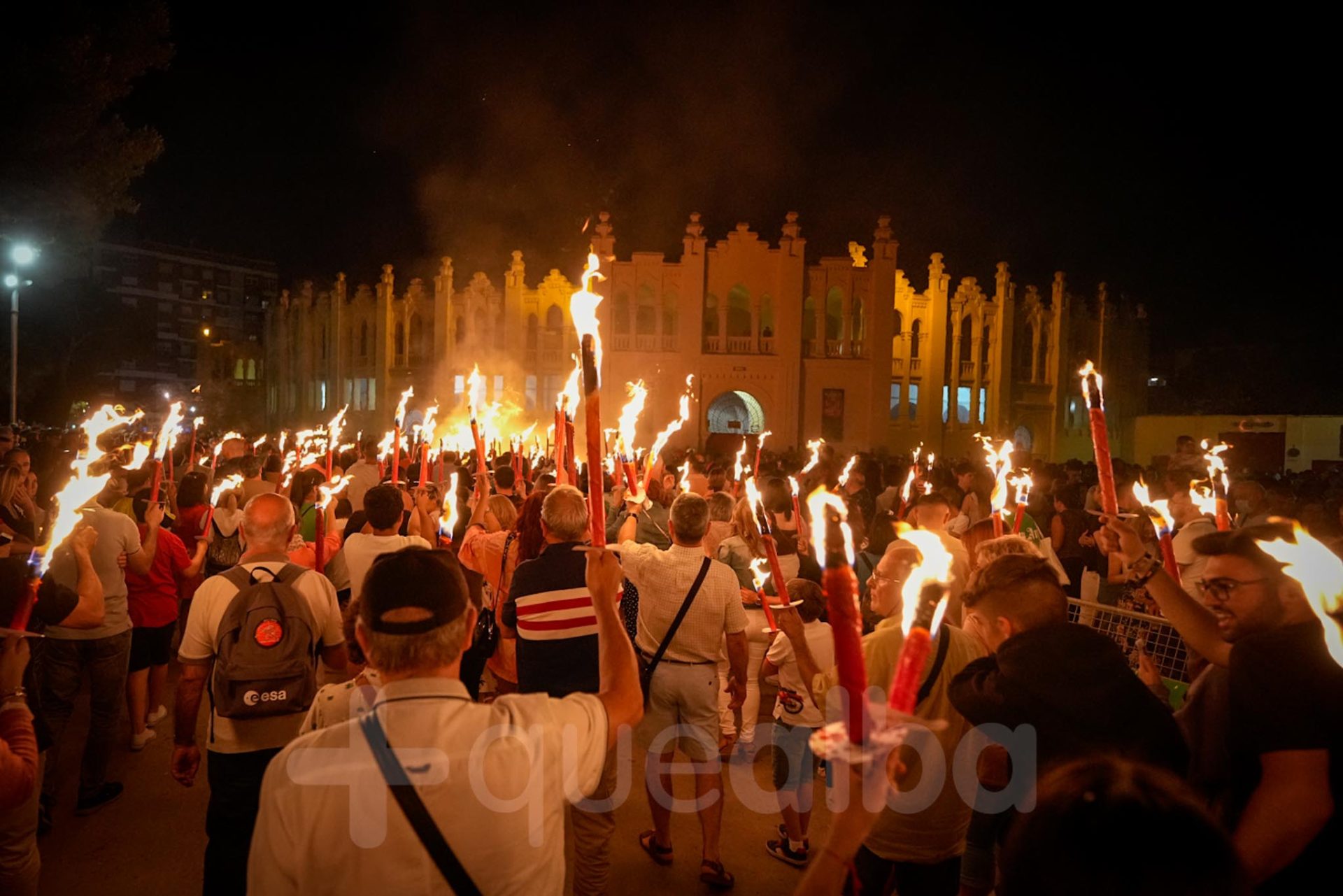 A las 22.55 horas ha tenido lugar un toque festivo de campanas, con el que daba comienzo la marcha de antorchas, que arrancaba desde la puerta del Ayuntamiento, donde se han entregado 5.000 antorchas, entre quienes han querido sumarse a este desfile que terminaba en la zona de aparcamiento de la Plaza de Toros.