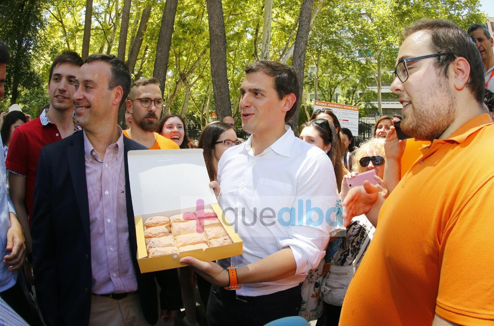 Al candidato de Ciudadanos a la Presidencia del Gobierno, Albert Rivera, le han regalado hoy una caja de los tradicionales Miguelitos de La Roda personalizados con el naranja de su partido. Se lo han dado durante la visita que ha realizado por el centro de la ciudad, hasta el Parque Abelardo Sánchez. Al recibirlos ha asegurado que «no llegan a Madrid» con la buena pinta que tenían.