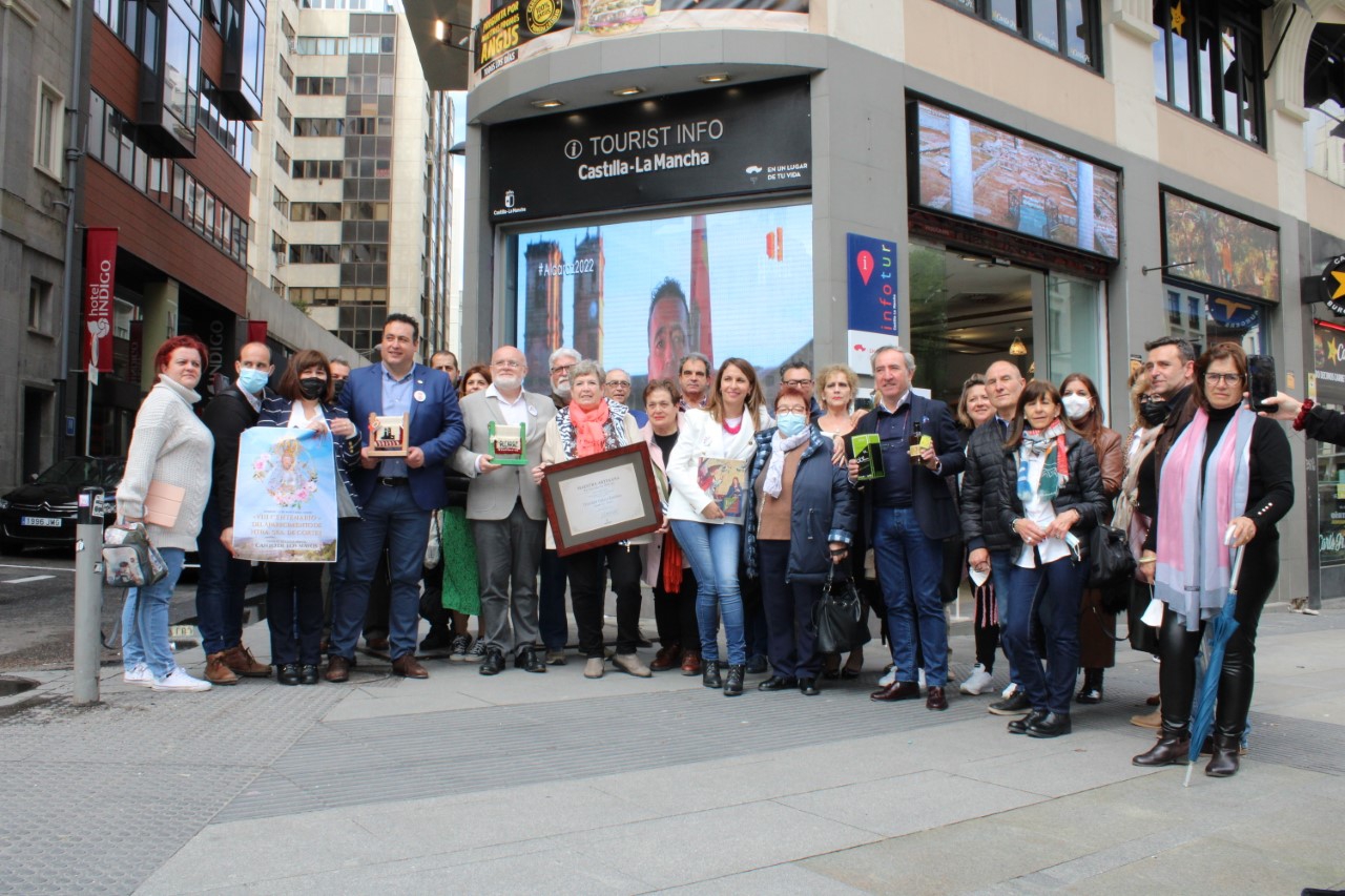 Durante este acto, en la Oficina de Promoción de Castilla-La Mancha en Madrid también se han puesto en valor, algunas actividades realizadas este año, como la exposición del VIII Centenario de la Devoción a la Virgen de Cortes (Alcaraz 1222-2022), que estuvo en la Casa Perona, sede de la Delegación de la Junta en Albacete y en el Centro Cultural de Alcaraz, donde se pudo comprobar diferentes momentos, simbología, hitos e imágenes emblemáticas, relacionadas con el VIII Centenario, como el logotipo y el cuño oficial del Año Jubilar, cuadros de la patronal de Alcaraz, una corona donada, escrituras, expedientes, fotografías y planos del Santuario, que sirvieron en en su conjunto, para conocer la advocación local, generada y arraigada por la Virgen de Cortes, en la Sierra de Alcaraz.