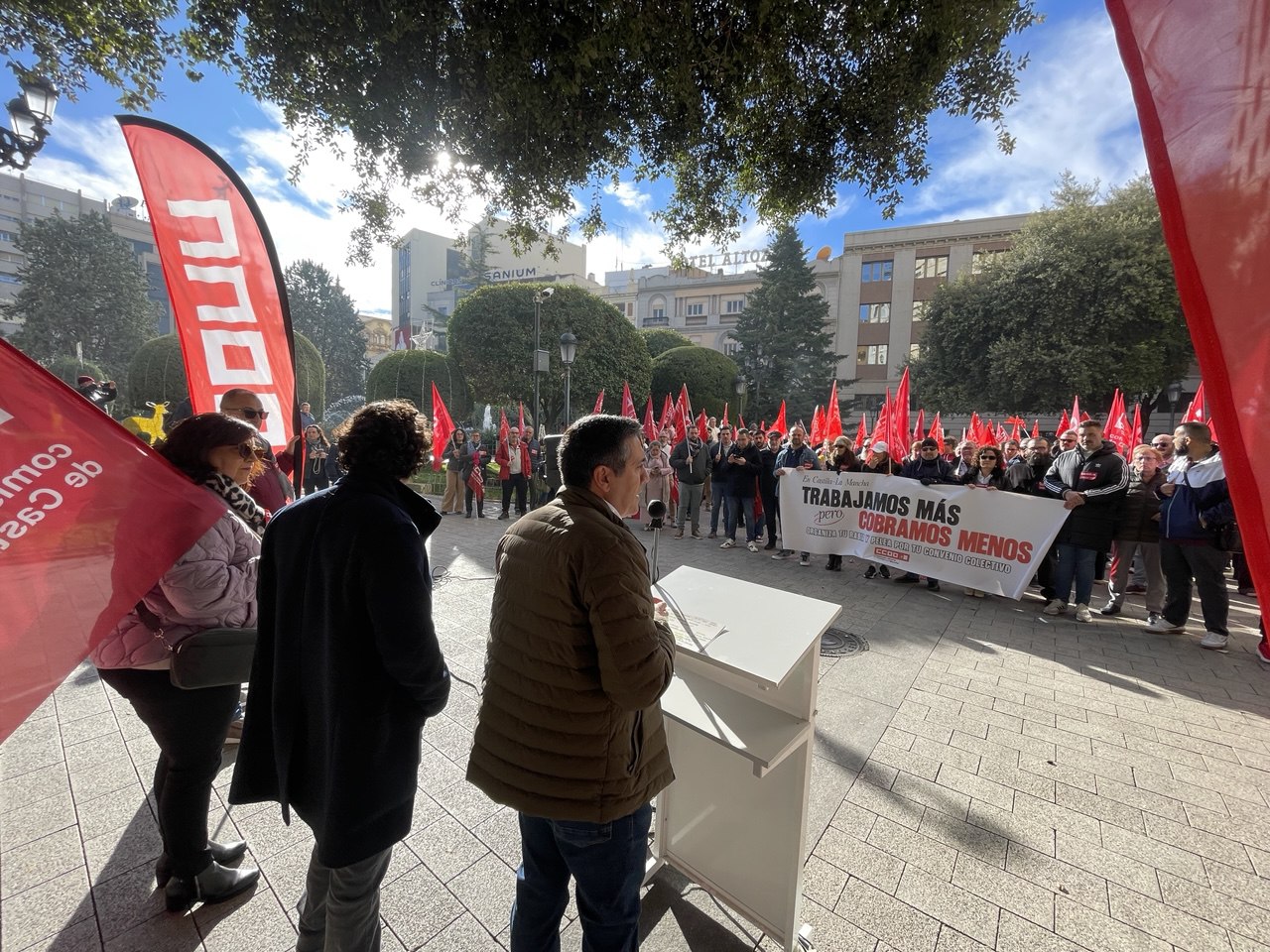Bajo el lema “Trabajamos más, pero ganamos menos” CCOO Albacete ha celebrado esta mañana una concentración que ha reunido a más de 400 personas procedentes de toda la provincia, y en la que han intervenido el secretario general de CCOO CLM, Javier Ortega, el secretario general de CCOO Albacete, Paco Gómez, y la responsable de la Federación de Servicios en Albacete, Carmen Olivas.