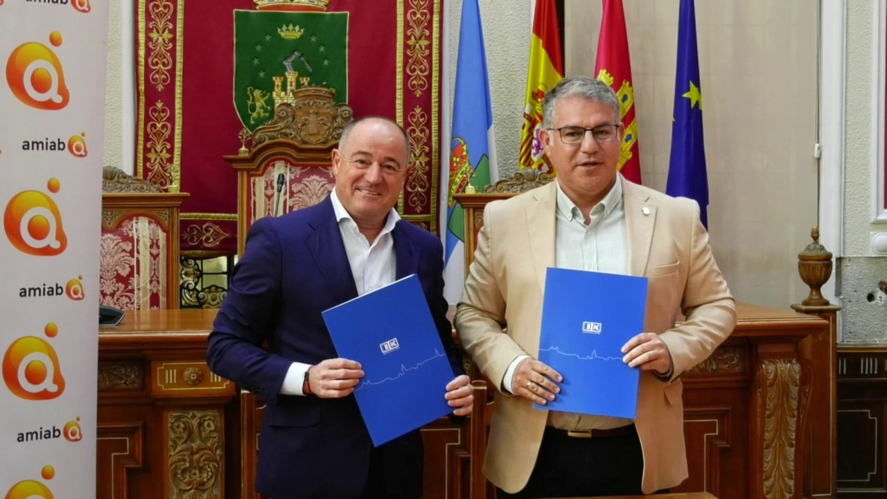 El presidente de amiab, Emilio Sáez, y el alcalde de Hellín, Manuel Serena, han firmado un convenio marco de colaboración con el fin de colaborar, aunar y coordinar esfuerzos al objeto de contribuir a la plena inclusión de las personas que más difícil en nuestra sociedad, eliminando barreras de las personas vulnerables.