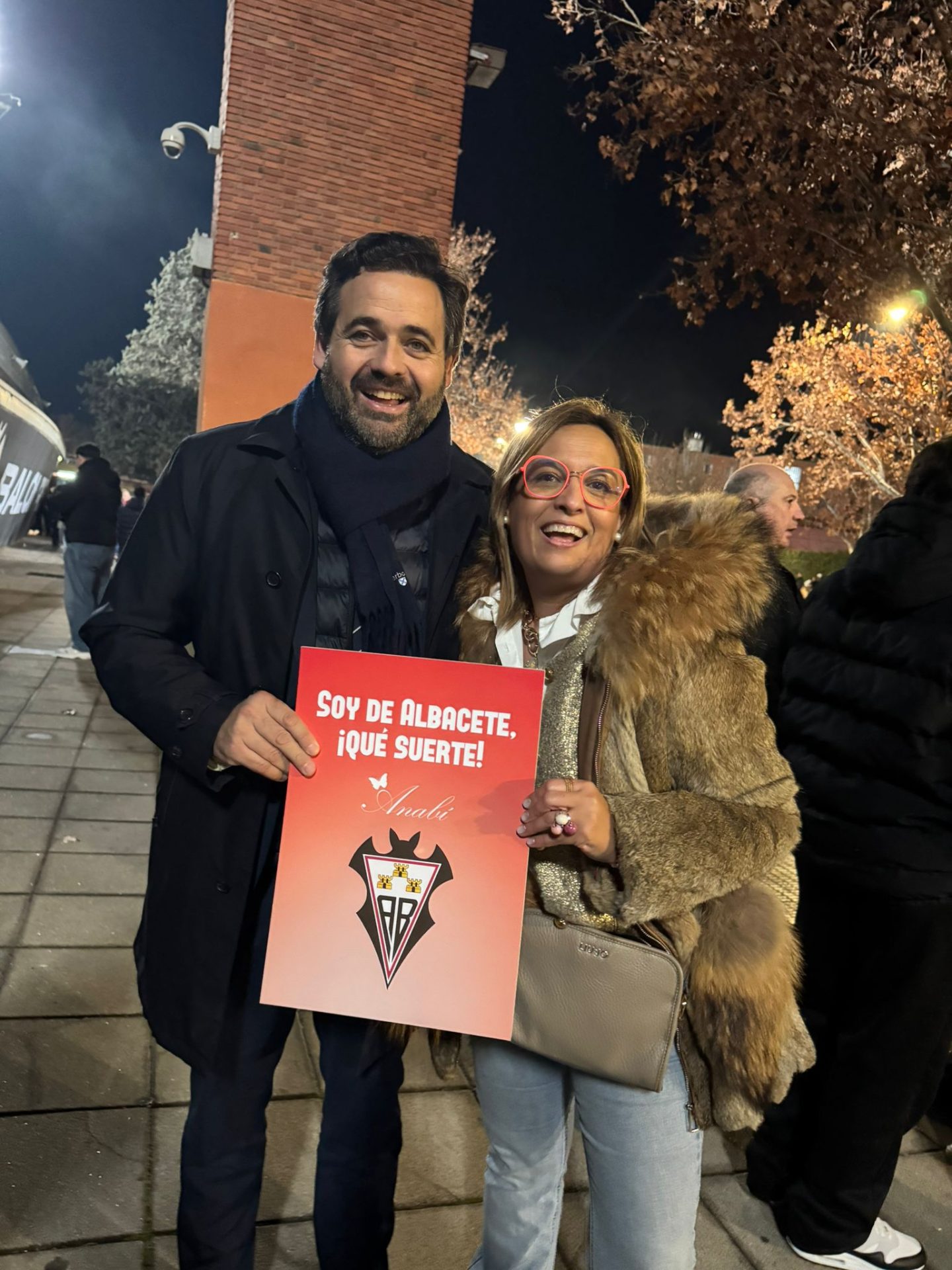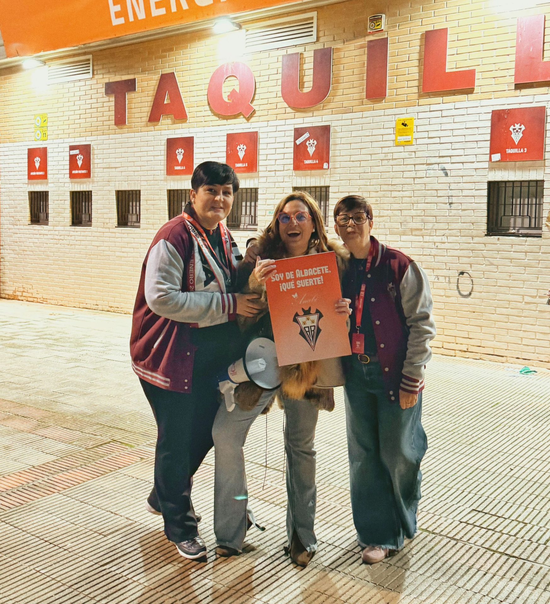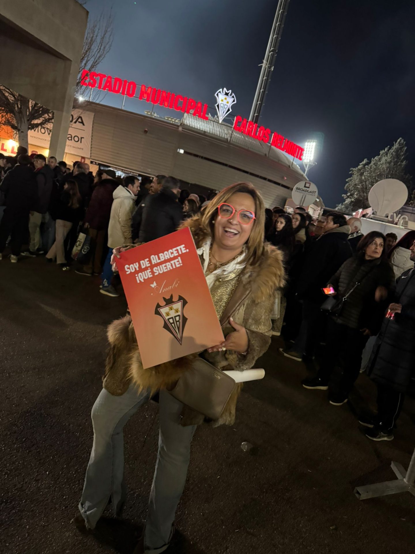La empresaria albaceteña Ana Bielsa, más conocida como Anabi, no ha faltado a animar antes del partido de Copa del Rey entre el Albacete Balompié y el Real Madrid. Además, megáfono en mano durante la previa del encuentro, y con su propia campaña con los carteles ‘Soy de Albacete, qué suerte’.