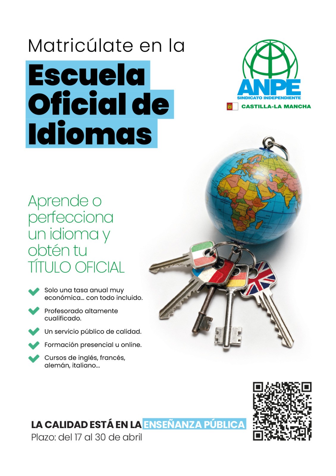 El sindicato ANPE ha lanzado un llamamiento a la ciudadanía para que aproveche el periodo de admisión y se matricule en las Escuelas Oficiales de Idiomas (EOI) de Castilla-La Mancha, destacando su papel como un servicio público de calidad, accesible y clave para la formación académica y profesional.