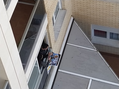Una lectora nos remite estas fotografías del aperitivo que por este soleado Domingo de Resurrección en Albacete han mantenido varios de sus vecinos en el edificio. Eso sí, cada uno en su balcón, patio y terraza, pero todos en casa.