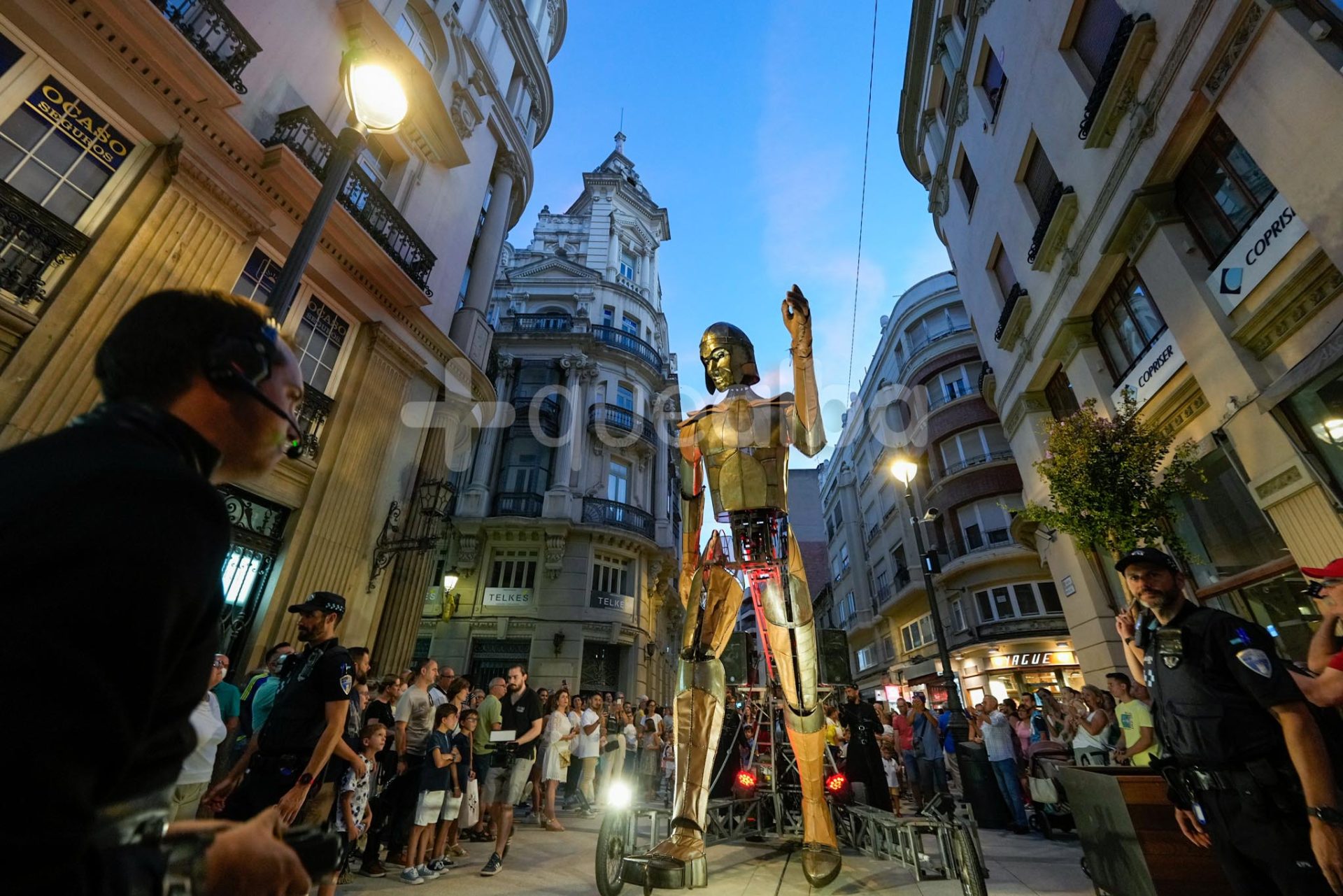 ‘Aquiles’, un gigante de más de 5 metros de altura,ha atravesado el eje peatonalizado y remodelado de las calles Tesifonte Gallego, desde la calle Tinte; Marqués de Molins y la Plaza del Altozano.