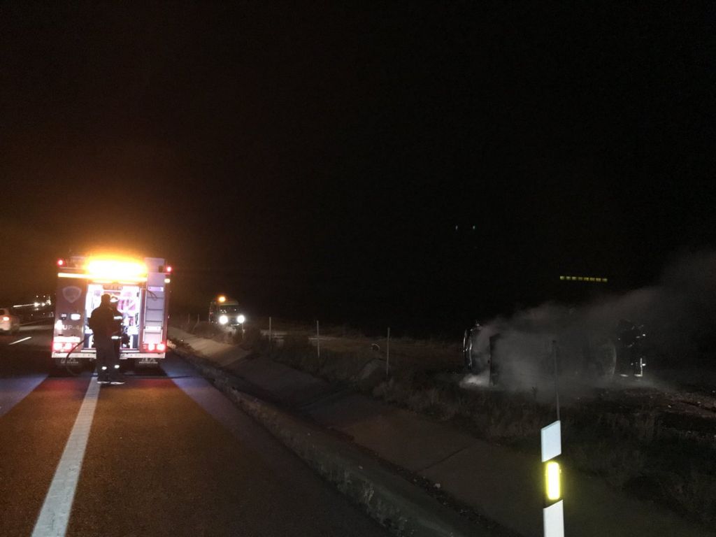 El SEPEI ha informado de este accidente, ocurrido a las siete de la mañana. El coche salió ardiendo al volcar, pero el conductor pudo salir de él.