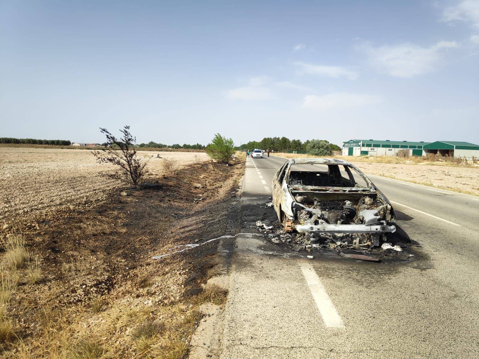 Bomberos, Policía Local y Guardia Civil han tenido que colaborar esta tarde en el incendio de un vehículo en la carretera de Santa Ana.