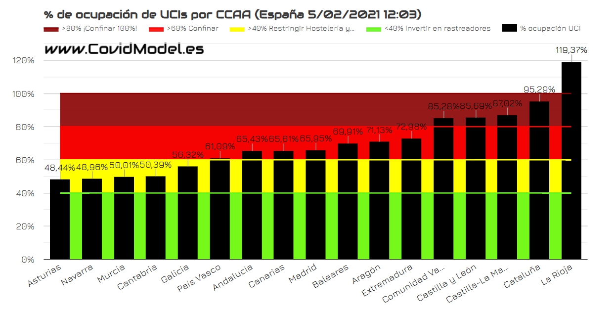 La única Comunidad Autónoma donde hay más enfermos con necesidad de UCI que plazas disponibles es La Rioja, donde un 18% de los enfermos críticos no tienen cama de UCI por estar llenas, y todo ello a pesar del espectacular aumento en el número de camas UCI disponibles realizado por los hospitales de esta comunidad en las últimas semanas.
