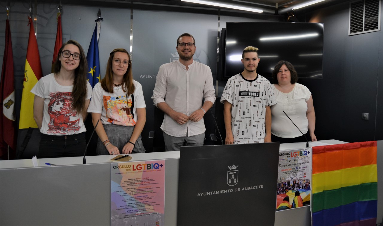El concejal de Igualdad del Ayuntamiento de Albacete, Manuel Martínez, ha presentado esta mañana, junto a representantes de las asociaciones Abanico por la Diversidad y Torre Púrpura los actos que se celebrarán en la ciudad con motivo de la conmemoración del Orgullo LGTBIQ+ 2019.