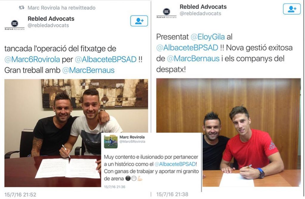 El despacho de abogados que ha gestionado los fichajes de Marc Rovirola y Eloy Gila por el Albacete Balompié, ambos procedentes del Llagostera, aunque estuvieron cedidos la última temporada, ha mostrado en su cuenta de Twitter las imágenes de ambos jugadores firmando sus contratos con el Alba.