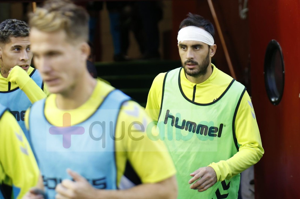 El jugador del Albacete Balompié Gentiletti ha salido a calentar con este curioso vendaje en la cabeza.