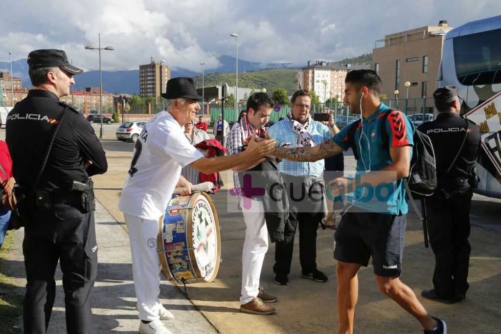 Los cinco aficionados del Albacete Balompié, entre ellos el crack de Parrita, con su bombo evidentemente, que han acudido al Toralín esta tarde para animar a los de César Ferrando, han estado recibiendo al equipo a su llegada al estadio de la Ponferradina. Por cierto, que casi que había más Policía que aficionados y eso que son inofensivos. Esperamos que vean una victoria del Alba.