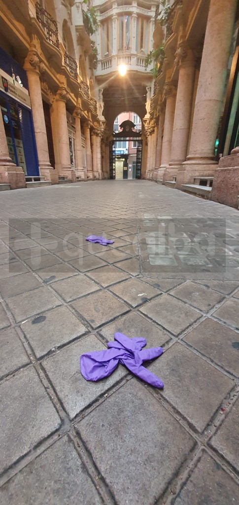 Un buen amigo de esta casa nos manda esta imagen tomada este mismo sábado en una de las joyas de la ciudad de Albacete como es el Pasaje Lodares. Allí, mientras caminaba se ha encontrado con un par de guantes tirados en el acceso a esta genial obra arquitectónica.