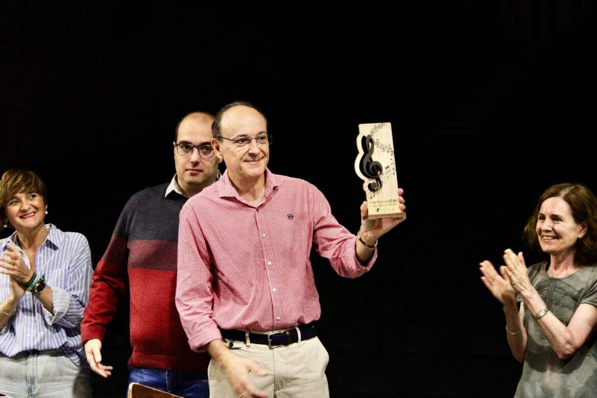 Un reconocimiento que ha recibido el director de la Banda Sinfónica Municipal de Albacete, Javier Artés, durante el acto celebrado en el Auditorio Municipal, contando con la presencia de la presidenta de Asprona, Amalia Serna, la vicepresidenta de esta asociación, María Dolores Olivares, el representante del equipo de portavoces de Albacete, Álvaro Aroca, la concejala de Cultura, Elena Serrallé y la concejala de Asuntos Sociales, Llanos Navarro.