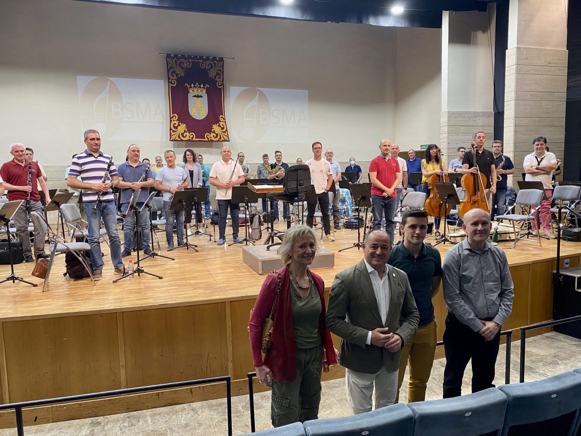 Durante el ensayo de la Banda Sinfónica, el alcalde, Emilio Sáez, acompañado por la presidenta de ASPRONA, Amalia Serna, el compositor, Luis Enrique Hidalgo, y el director de la BSMA, Miguel Vidagany, han presentado la pieza musical que se estrenará mañana en el concierto de la Banda en el Parque de Abelardo Sánchez.