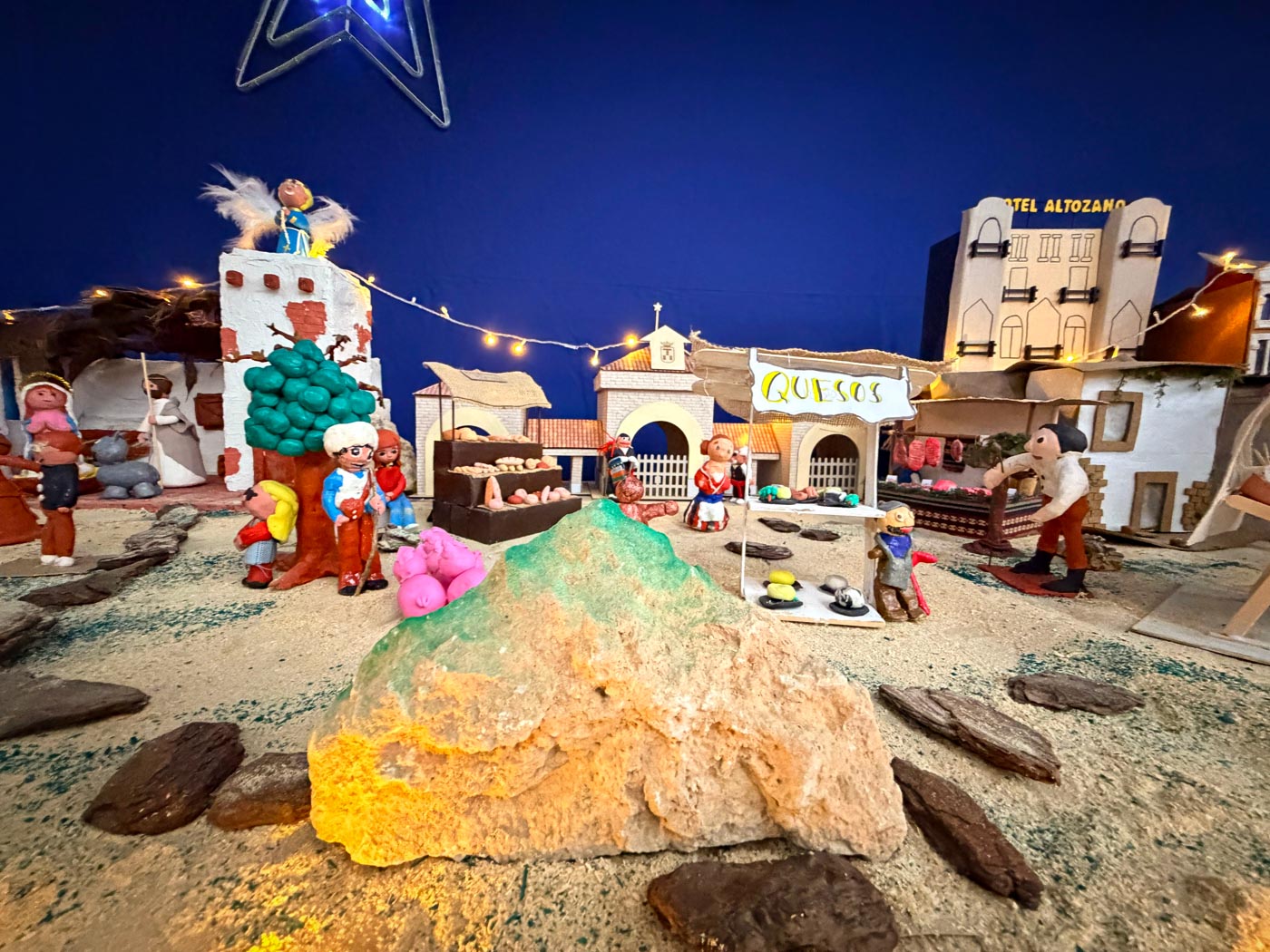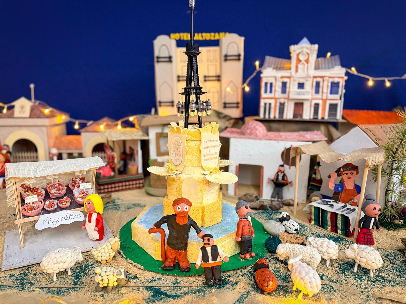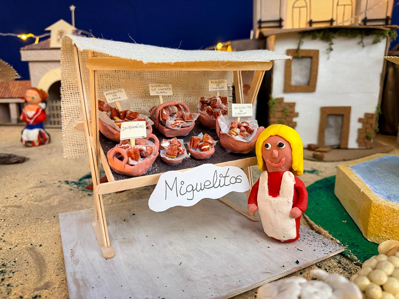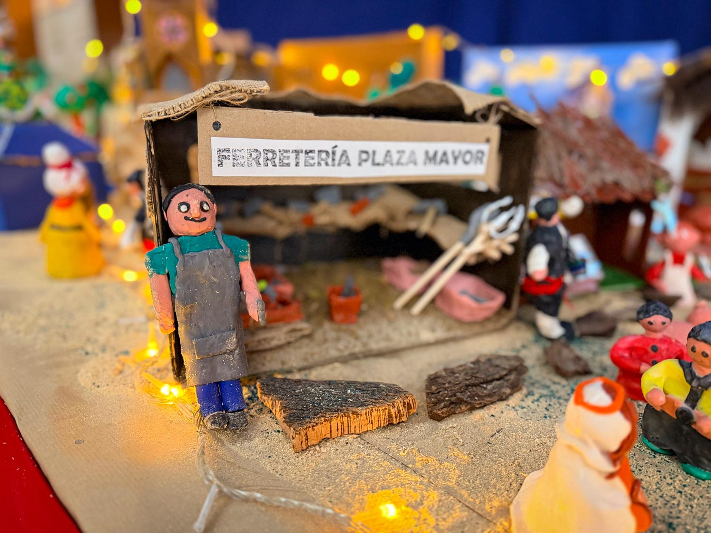También se ha reproducido comercios emblemáticos, como la Ferretería de la Plaza Mayor; o puestos de los tradicionales Miguelitos de La Roda; en un Belén donde, por supuesto, no faltan los pastores o el nacimiento del niño Jesús.