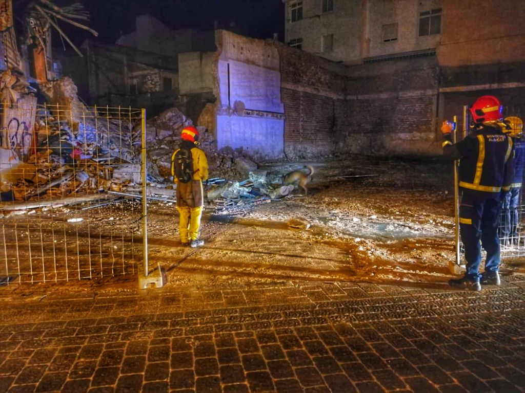 El derrumbe de una casa vieja en la calle Lozano de Albacete obligó a Bomberos de la ciudad y de la Diputación de Alicante a colaborar para comprobar si había víctimas en su interior.