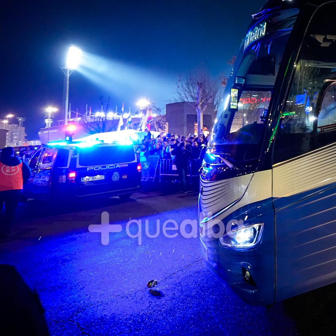 Fuertes aplausos y gritos de ánimo a la llegada del autobús del Albacete, mientras que el del Real Madrid era recibido con pitidos e incluso el lanzamiento de algún bote.