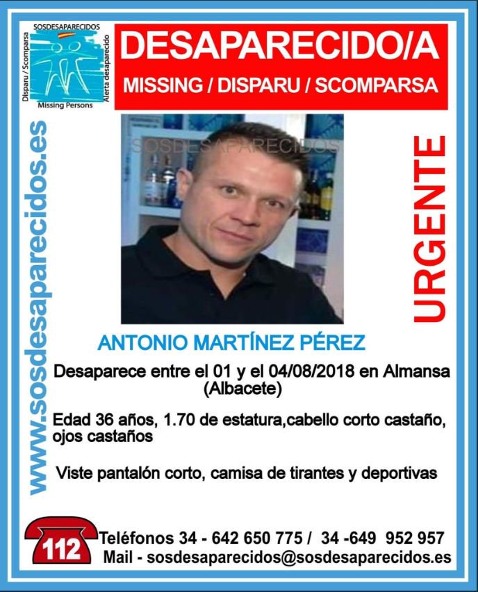 Antonio Martínez Pérez, de 36 años, desapareció en Almansa entre el 1 y el 4 de agosto y sigue en paradero desconocido. La Policía Local de Almansa ha pedido colaboración a todo aquel que lo haya visto con un mensaje en sus redes sociales.