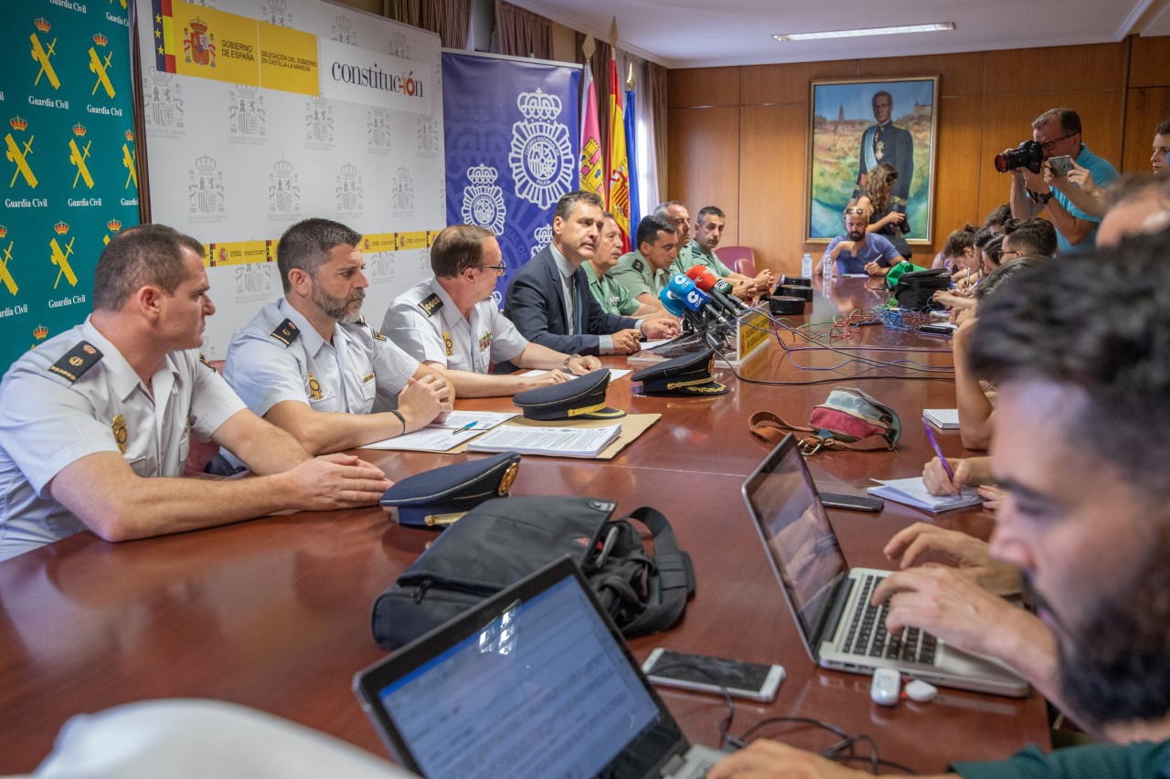 El delegado del Gobierno de España en Castilla-La Mancha, Francisco Tierraseca, el coronel de la segunda Zona de la Guardia Civil, Gabriel Llamazares, el jefe regional de Operaciones de la Policía Nacional, Javier Pérez Castillo, y miembros de ambos cuerpos que han participado en el operativo, han presentado, en la Delegación del Gobierno, los detalles de la operación NOEL, desarrollada conjuntamente entre Guardia Civil y Policía Nacional.