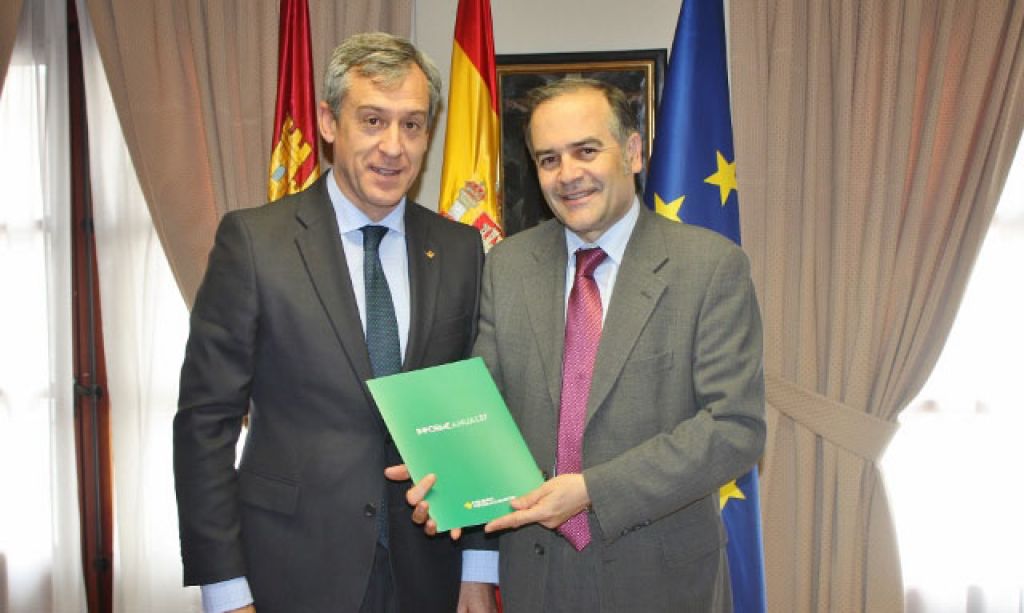 El presidente de Caja Rural Castilla-La Mancha, Javier López Martín, ha entregado al delegado del Gobierno en la región, José Julián Gregorio, la Memoria Anual de la entidad financiera correspondiente al ejercicio 2017, que será presentada a la Asamblea General de socios convocada para el próximo día 20 de abril.