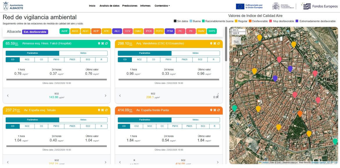 Los barrios de los hospitales, en Hermanos Falcó y la zona del Perpetuo Socorro, son, de hecho, las dos únicas zonas de medición en Albacete que -con los datos este lunes 23 de febrero por la noche- tienen una calidad del aire buena.