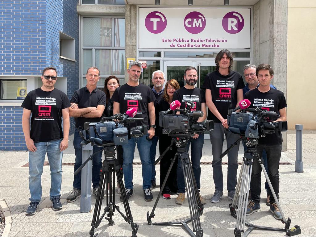 Concentraciones similares llevaron a cabo sus compañeros/as subcontratados en el resto de las delegaciones del ente público, todos y todas ellas vistiendo camisetas negras con el lema “Mismo trabajo, mismo salario” en letras blancas, el nombre de sus profesiones “cámaras y técnicos” y el logotipo de su empresa principal, el de Castilla-La Mancha Media. Comenzaron su movilización el miércoles pasado, coincidiendo con la celebración del Día Mundial de la Libertad de Prensa, y a partir de ahora, volverán a concentrarse y a lucir sus camisetas todos los miércoles, ‘miércoles negros’ que repetirán hasta conseguir que el Ente Público les reconozca sus derechos.