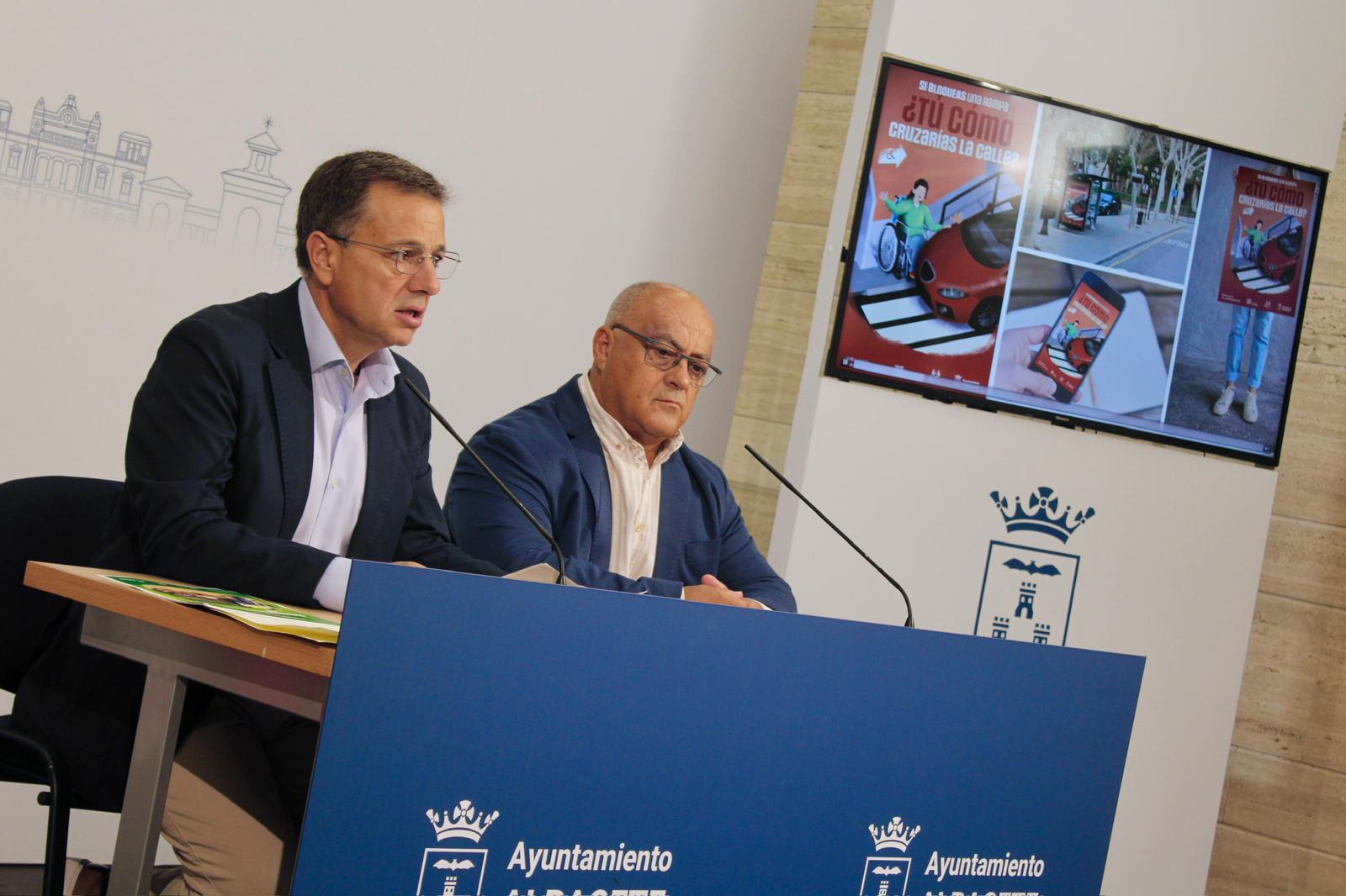 El alcalde de Albacete, Manuel Serrano, acompañado del presidente de Cocemfe Marcelino Escobar, ha presentado en rueda de prensa la Campaña de prácticas cívicas que ha puesto en marcha la Oficina de Accesibilidad bajo el lema ‘No es justo. La ciudad es de todos’.