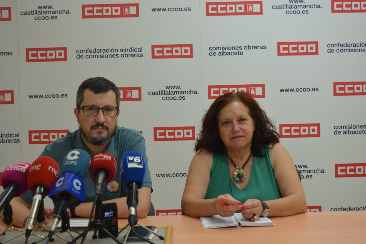 Los responsables sindicales, Alberto Jiménez, secretario provincial del sindicato de Enseñanza CCOO de Albacete, junto a la secretaria de Organización del sindicato de Enseñanza, Carmen Iniesta, han informado hoy sobre la campaña de reclamaciones para conseguir el reconocimiento contra los despidos de docentes interinos producidos en el mes de junio del periodo correspondiente a los años 2013-2017.