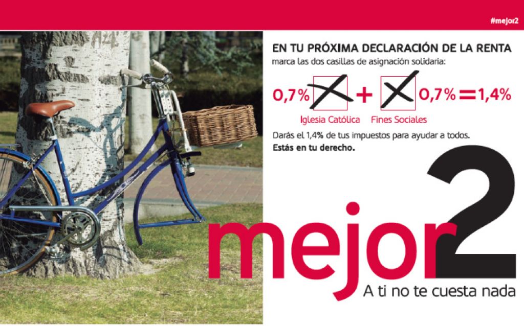 Con el lema «En tu próxima Declaración de la Renta: mejor2», Cáritas quiere llamar la atención de los ciudadanos sobre la posibilidad que tienen de duplicar –y de mejorar— su compromiso solidario a través de la Declaración de la Renta: al marcar ambas opciones de forma simultánea, los ciudadanos estarán colaborando a la vez, y sin coste añadido alguno, con un 0,7% de su base imponible a sostener la acción de la Iglesia y con otro 0,7% a apoyar los fines sociales que desarrollan Cáritas y otras muchas organizaciones que reciben fondos del IRPF para sostener una parte de su labor solidaria.