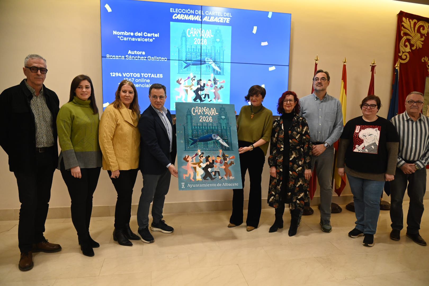 El alcalde Manuel Serrano, junto con concejales de los grupos políticos municipales, ha presentado el cartel del Carnaval 2026, surgido de la votación popular entre los tres seleccionados previamente por un jurado y que recibirá un premio de 1.500 euros.