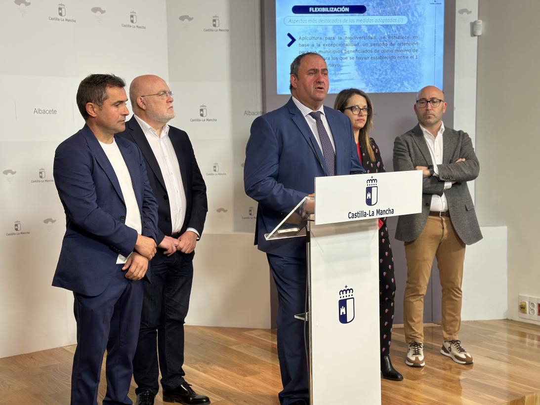 En esta rueda de prensa, han acompañado al consejero, el delegado de la Junta en Albacete, Pedro Antonio Ruíz; la viceconsejera de Política Agraria Común y Políticas Agroambientales; el director general de Agricultura y Ganadería, Jesús Fernández; y el delegado de Agricultura, Ganadería y Desarrollo Rural, Ramón Sáez.