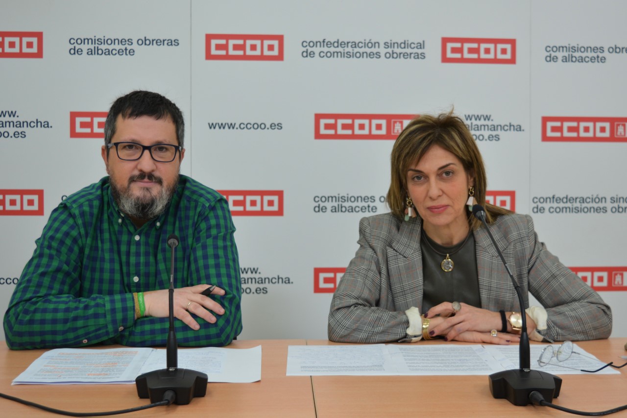 La secretaria general de CCOO en Albacete, Carmen Juste junto al secretario general de la Federación de Enseñanza de CCOO en Albacete, Alberto Jiménez han denunciado esta mañana en rueda de prensa que “la administración educativa de la provincia de Albacete mantiene a 97 personas trabajadoras en “precario” con la oposición aprobada y la plaza adjudicada. Un colectivo que tiene contratos fijos-discontinuos que merman sus derechos y les impiden optar a la jubilación parcial; les exigen 42 meses para conseguir un trienio frente a los 36 del resto de trabajadores, el periodo vacacional les viene impuesto y sin opción a formarse como el resto de categorías de la JCCM.