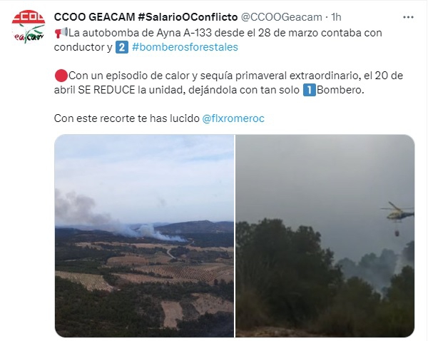 Un día después de que se diera por extinguido el incendio forestal que se declaró este viernes en Aýna, en la Sierra del Segura, la sección en Geacam del sindicato Comisiones Obreras ha denunciado recortes en el servicio del Infocam en esta localidad.