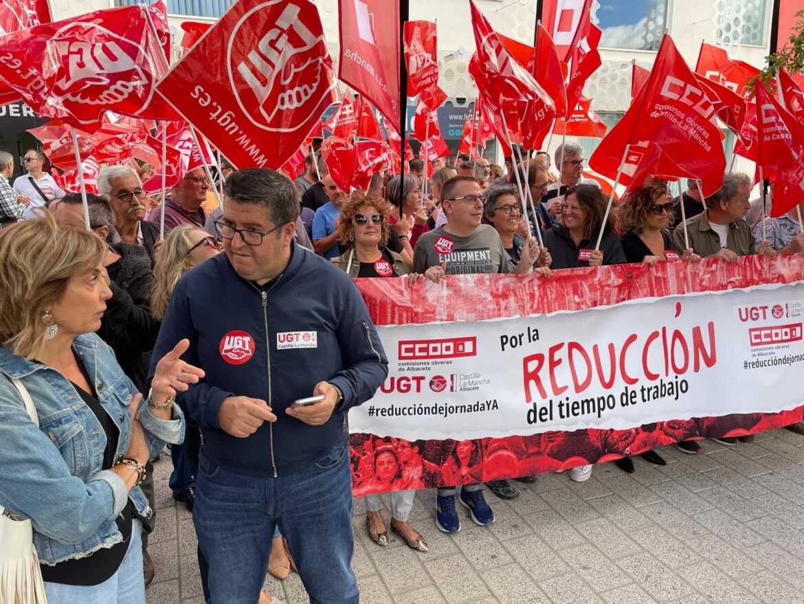 Comisiones Obreras y UGT se han concentrado este jueves frente a las sedes de las patronales en las cinco capitales de provincia de Castilla-La Mancha, -y en el conjunto del país-, para exigir la reducción de la jornada laboral a las 37,5 horas, una necesidad, una cuestión de justicia social y un mecanismo de solidaridad.