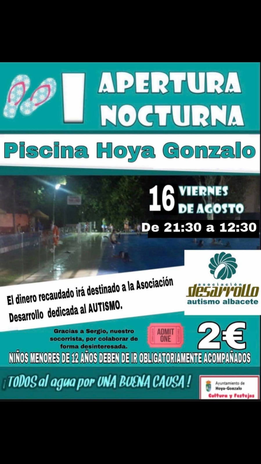 Este viernes, 16 de agosto, Hoya Gonzalo celebra su I Apertura Nocturna de la Piscina con una fin solidario. El dinero recaudado en esta actividad irá destinado a la Asociación Desarrollo, que trabaja con personas con autismo y sus familias.