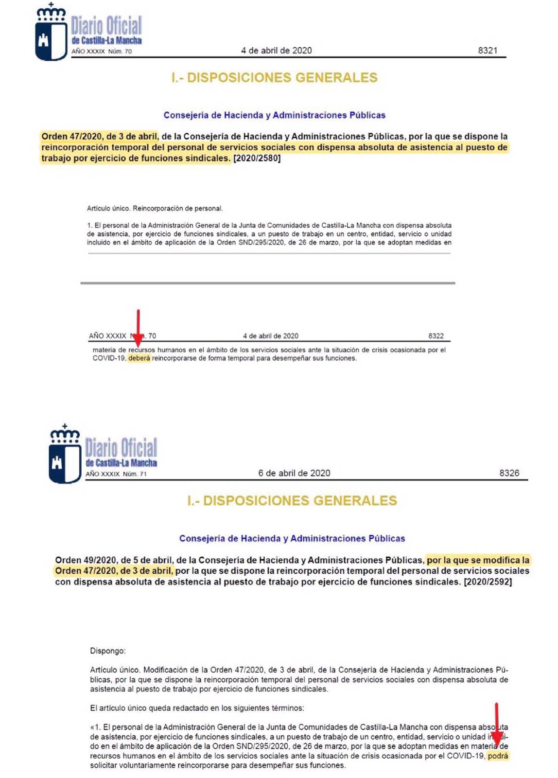 El partido naranja señala que el 4 de abril se publicó en el BOE la Orden SND/322/2020, de 3 de abril, por la cual se habilitaba a las comunidades autónomas para que los liberados sindicales de centros de servicios sociales de carácter residencial pudieran, de forma voluntaria, reincorporarse a sus puestos. En consecuencia, el Diario Oficial de Castilla-La Mancha (DOCM) del mismo día ejecutó esta medida con carácter obligatorio para los liberados sindicales mediante la Orden 47/2020, de 3 de abril, de la Consejería de Hacienda y Administraciones Públicas. Sin embargo, solo dos días después, el DOCM publicó la Orden 49/2020, de 5 de abril, que modificaba la anterior y establecía que la reincorporación de los liberados sindicales fuera con carácter voluntario. De hecho, la nueva Orden sustituyó el verbo “deberán” por “podrán”.