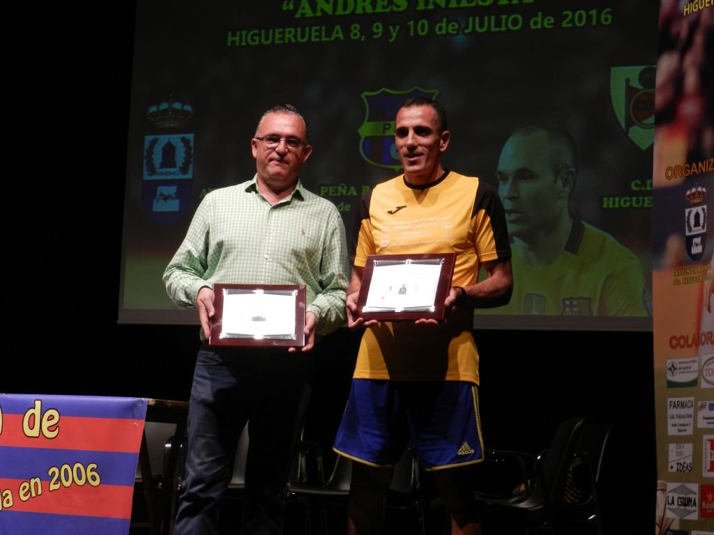 La Peña Barcelonista de la localidad, junto al Club Deportivo y el Ayuntamiento, han querido así premiar a dos ilustres higueruelanos, que han hecho posible que durante estos diez años se hayan podido celebrar estas Jornadas de Fútbol Base en Higueruela.