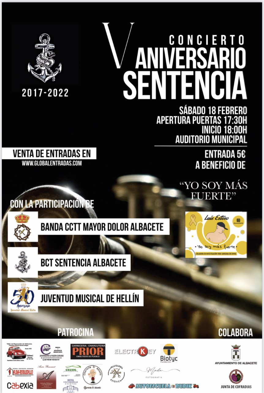 La joven banda de Cornetas y Tambores Sentencia, está de celebración por su V Aniversario fundacional, de esta manera han organizado un concierto benéfico a favor de la Asociación “Yo Soy Más Fuerte”, la entrada en su totalidad irá destinada a dicha Asociación que a su vez, ayuda a la investigación del Sarcoma de Ewing, una enfermedad considerada como rara.
