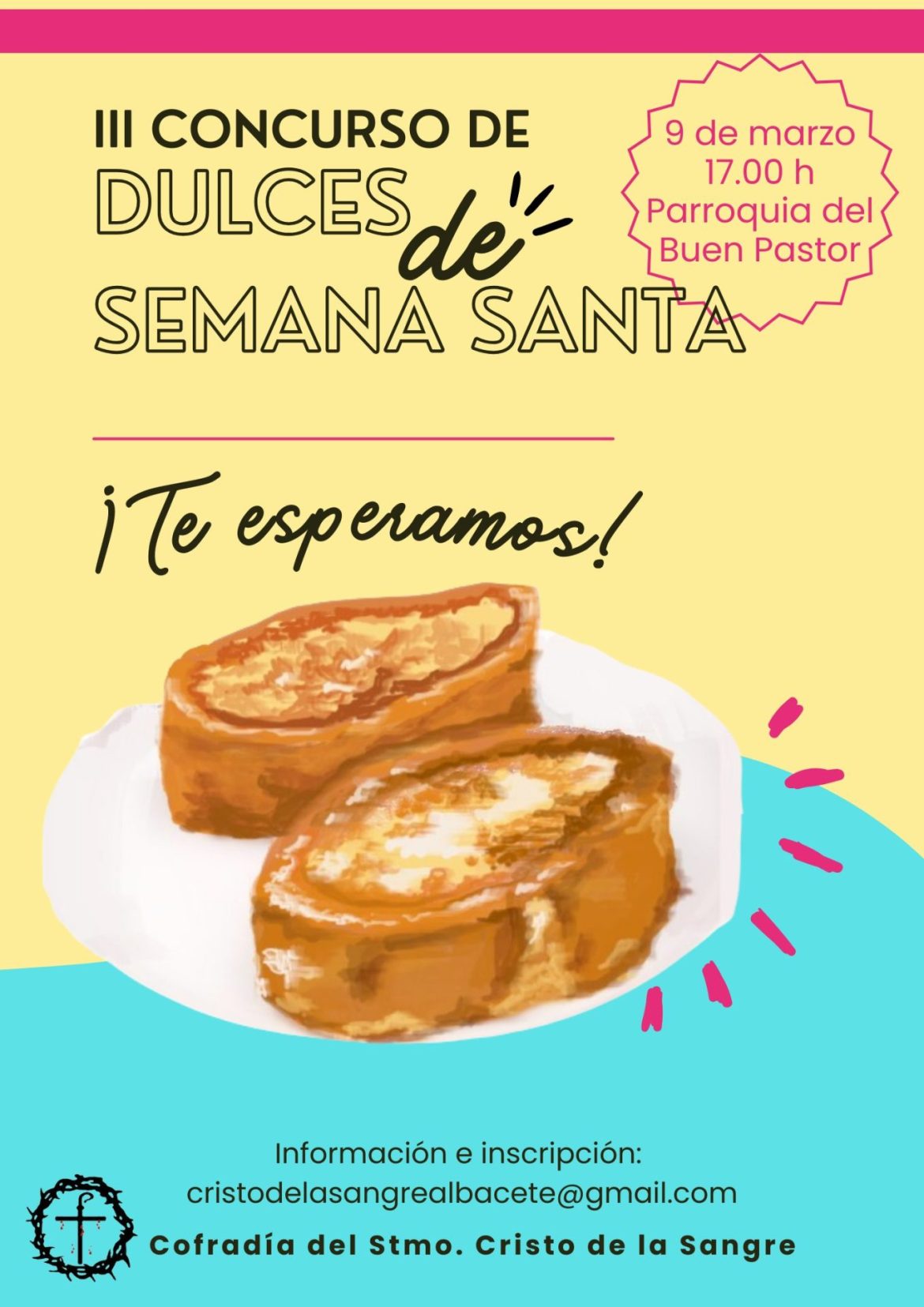 La Cofradía del Stmo. Cristo de la Sangre ha convocado el III Concurso de dulces de Cuaresma y Semana Santa que se celebrará el próximo domingo, 9 de marzo, a las 17.00 h. en los Salones de la Parroquia del Buen Pastor de Albacete.